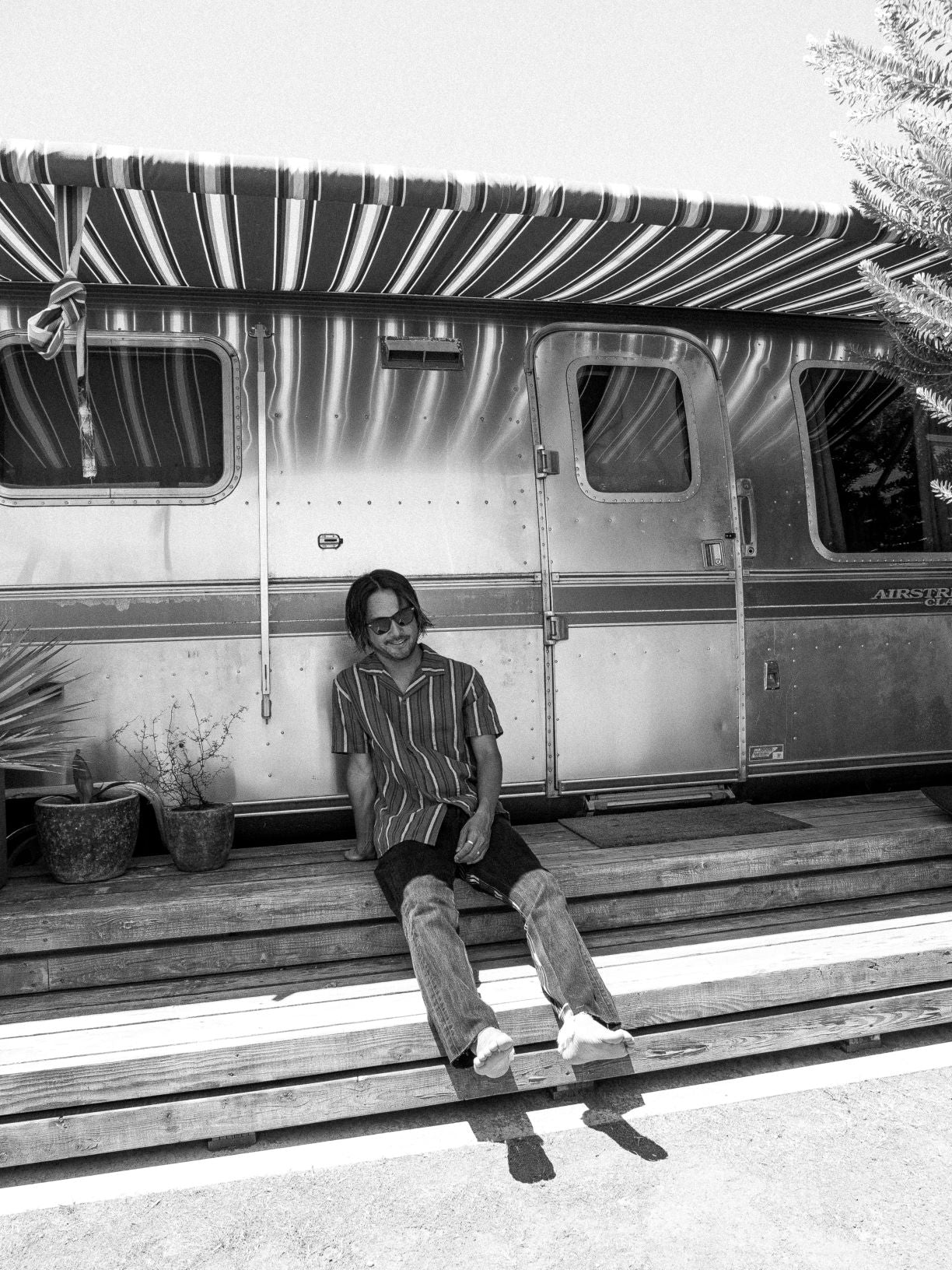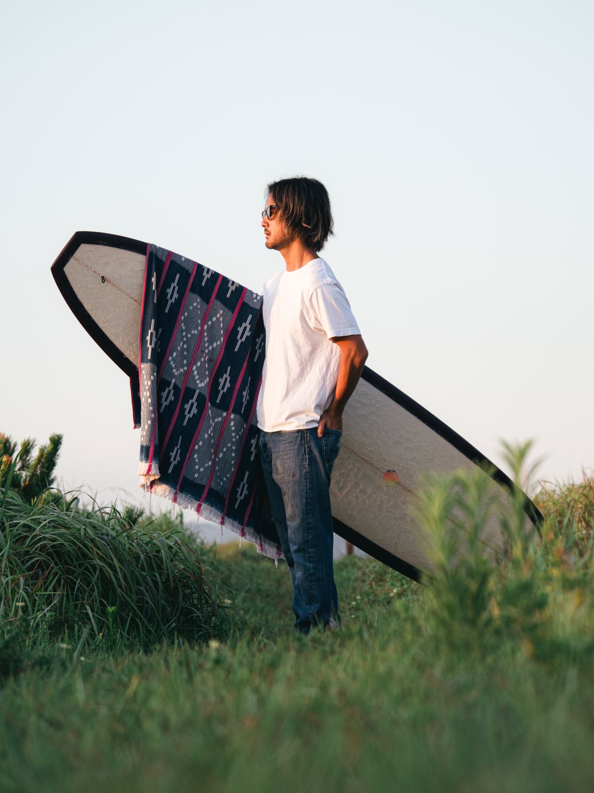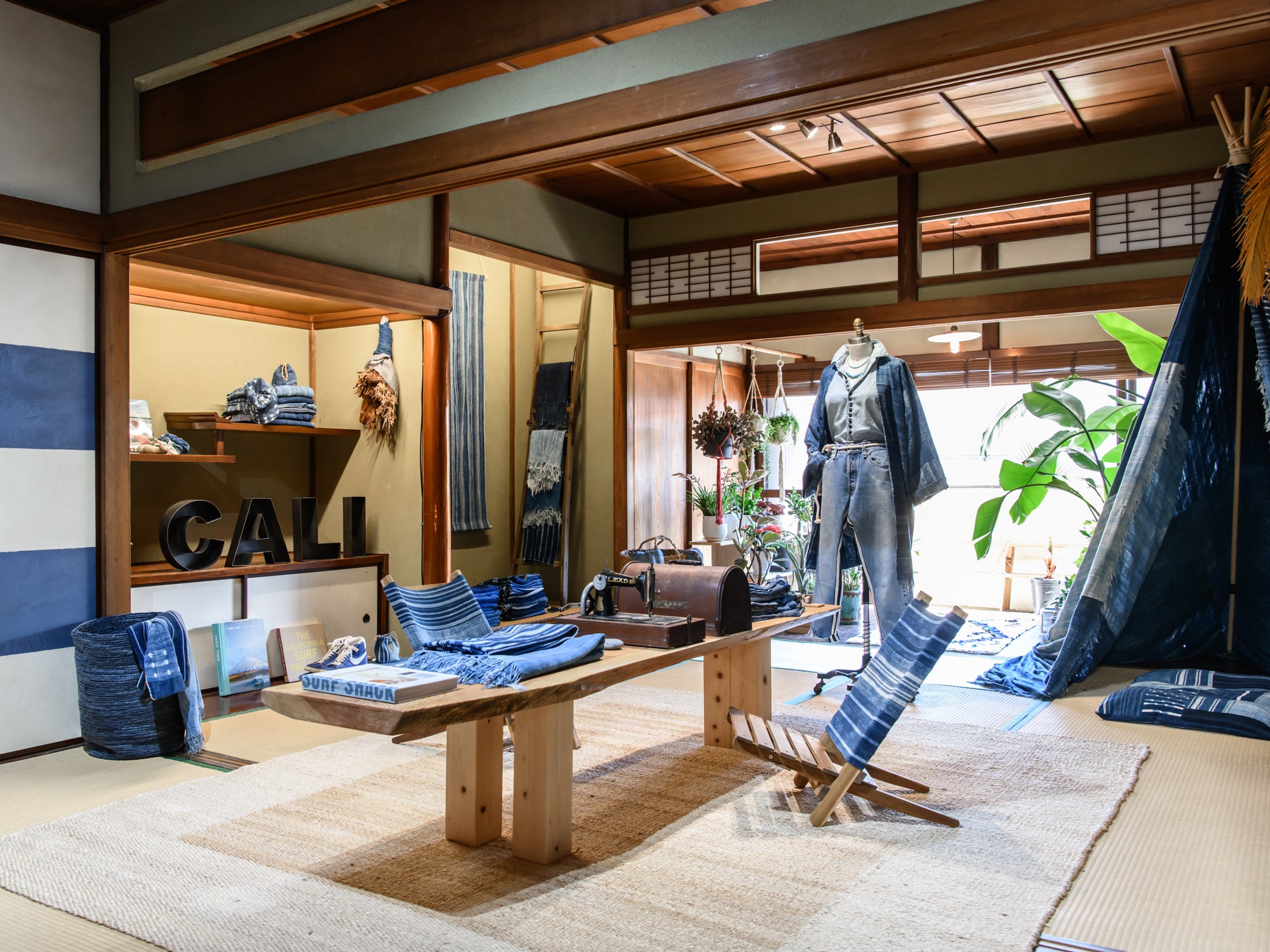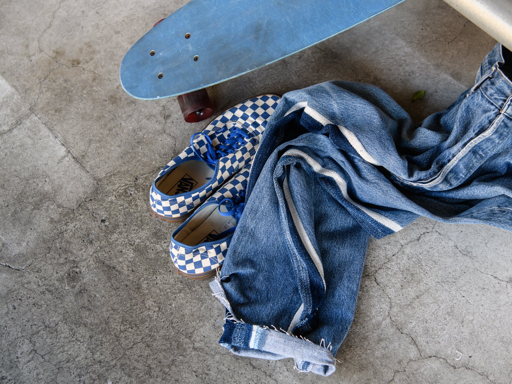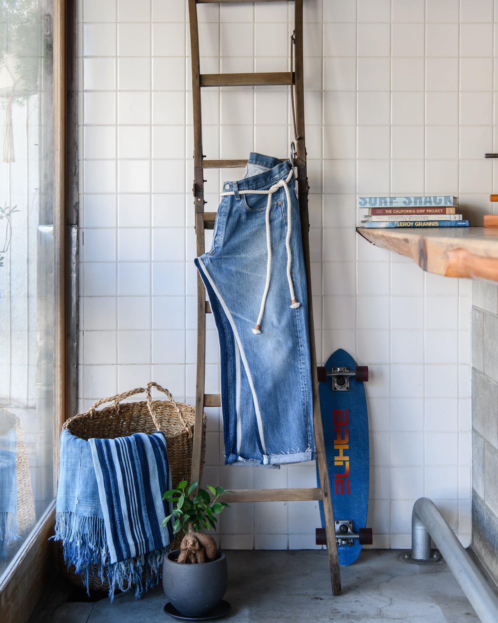White painter pants with vintage West African indigo textiles sewn on the inseam