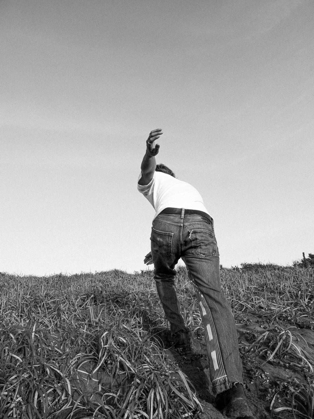 Up cycled denim jeans with vintage West African indigo textiles sawn on the inseam