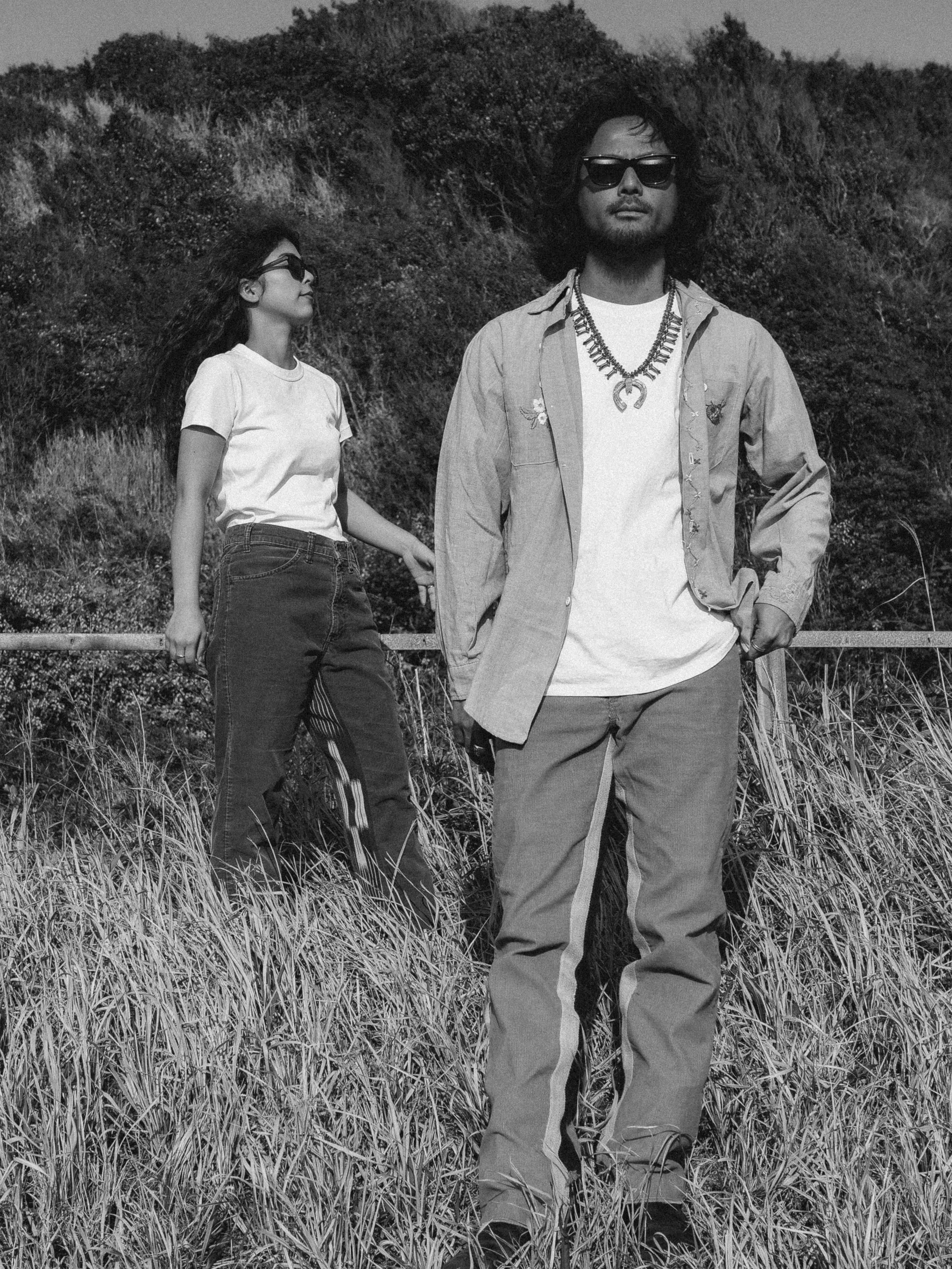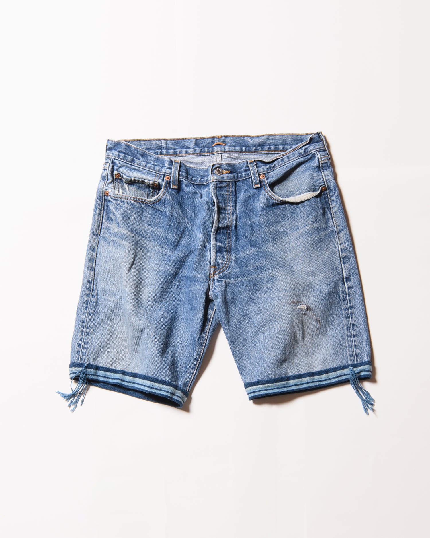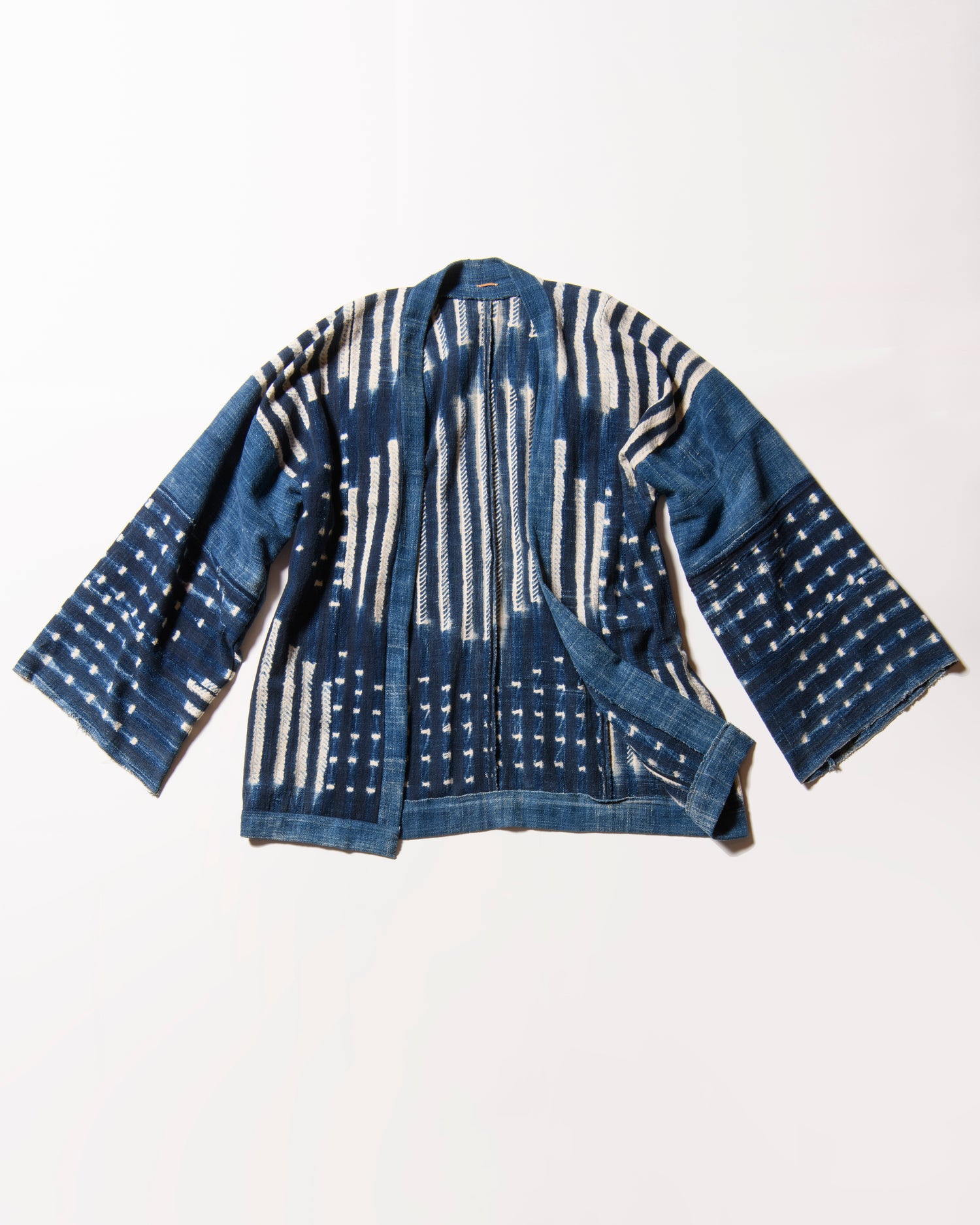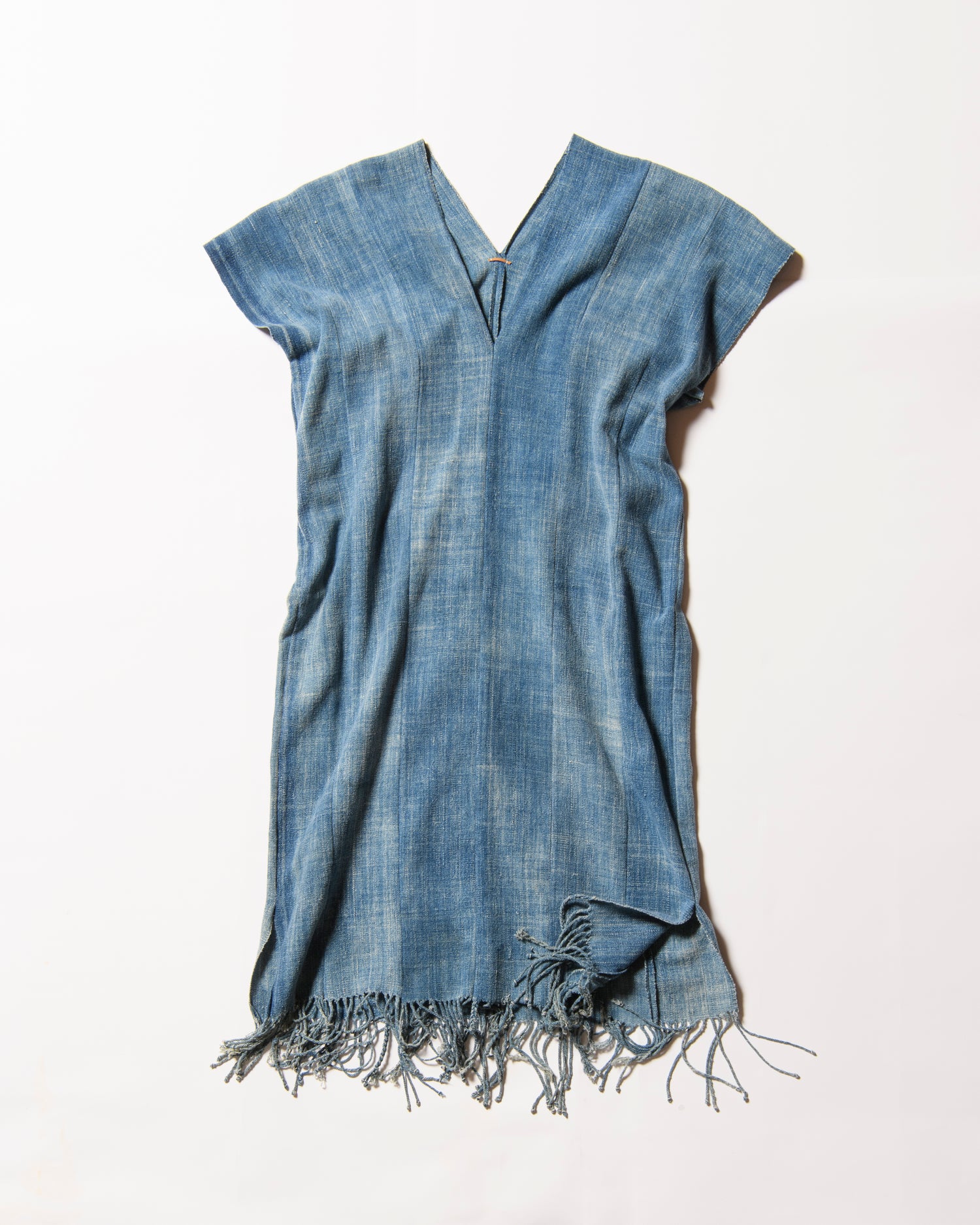 Up cycled denim jeans with vintage West African indigo textiles sawn on the inseam