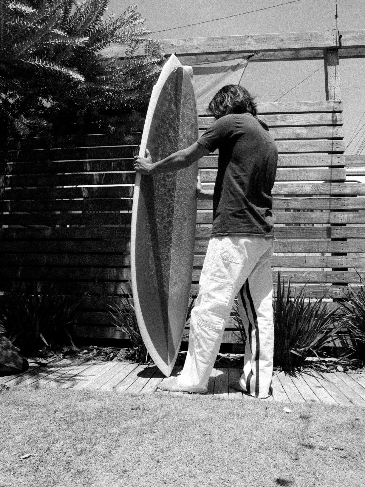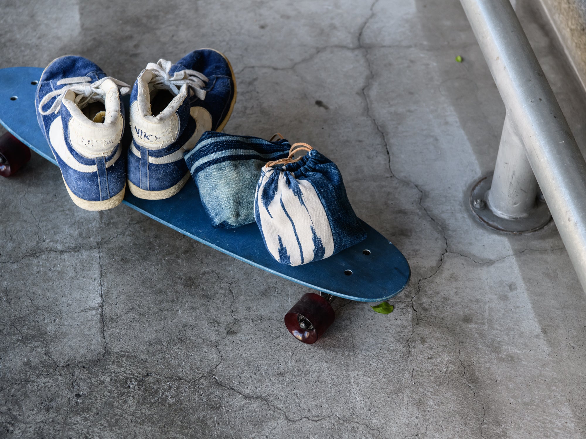 White painter pants with vintage West African indigo textiles sewn on the inseam