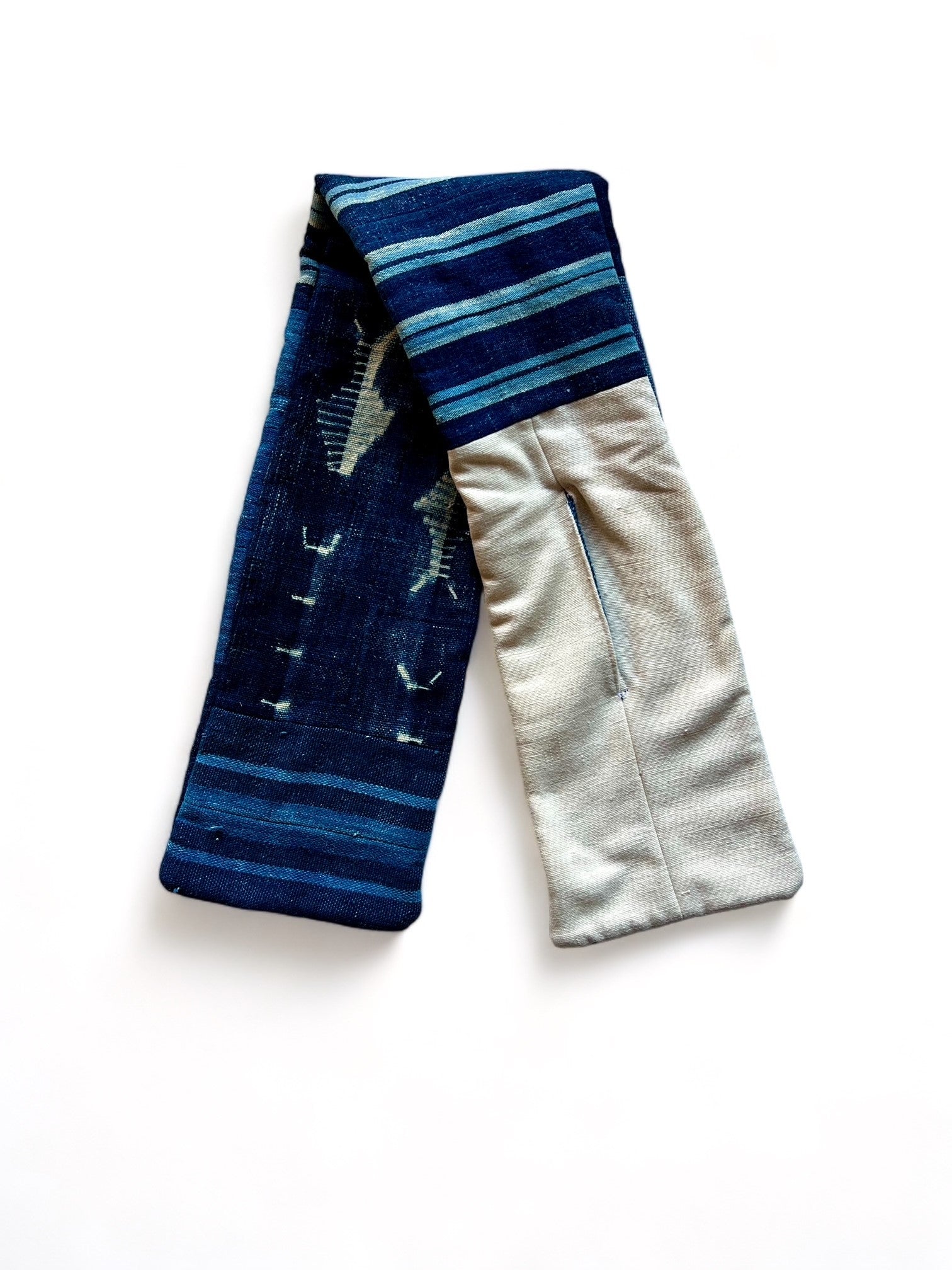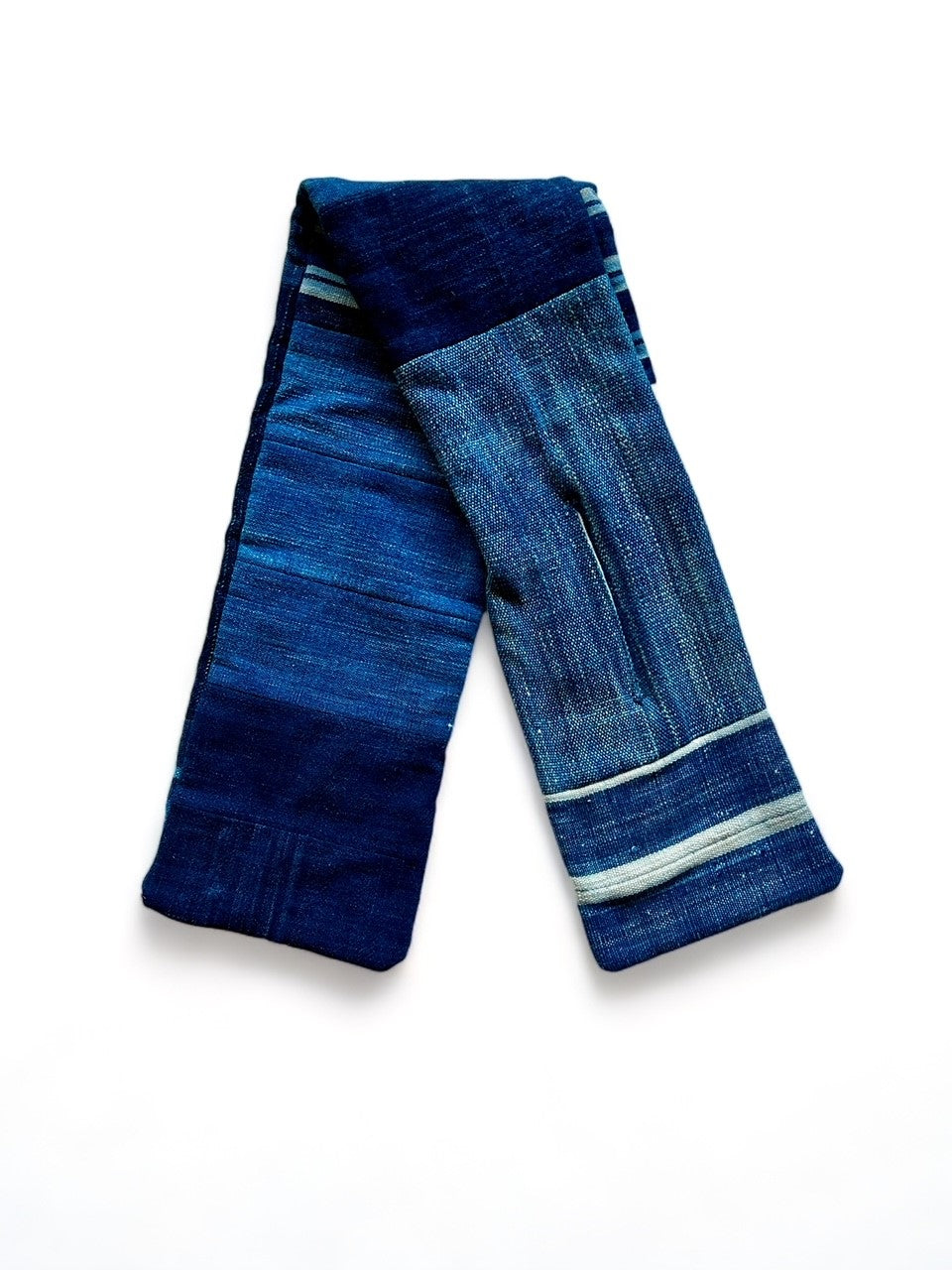 ビンテージのインディゴの生地を何種類も組み合わせて縫い合わされたマフラーです。生地の柔らかさが首に巻いたときに心地良く、冬の寒さを軽減させてくれます。巻き方も切れ込み部分に生地の反対側を入れて巻き付けるだけという手軽さです。表裏で生地のコンビネーションが違うので、両方の柄を楽しむことができると思います