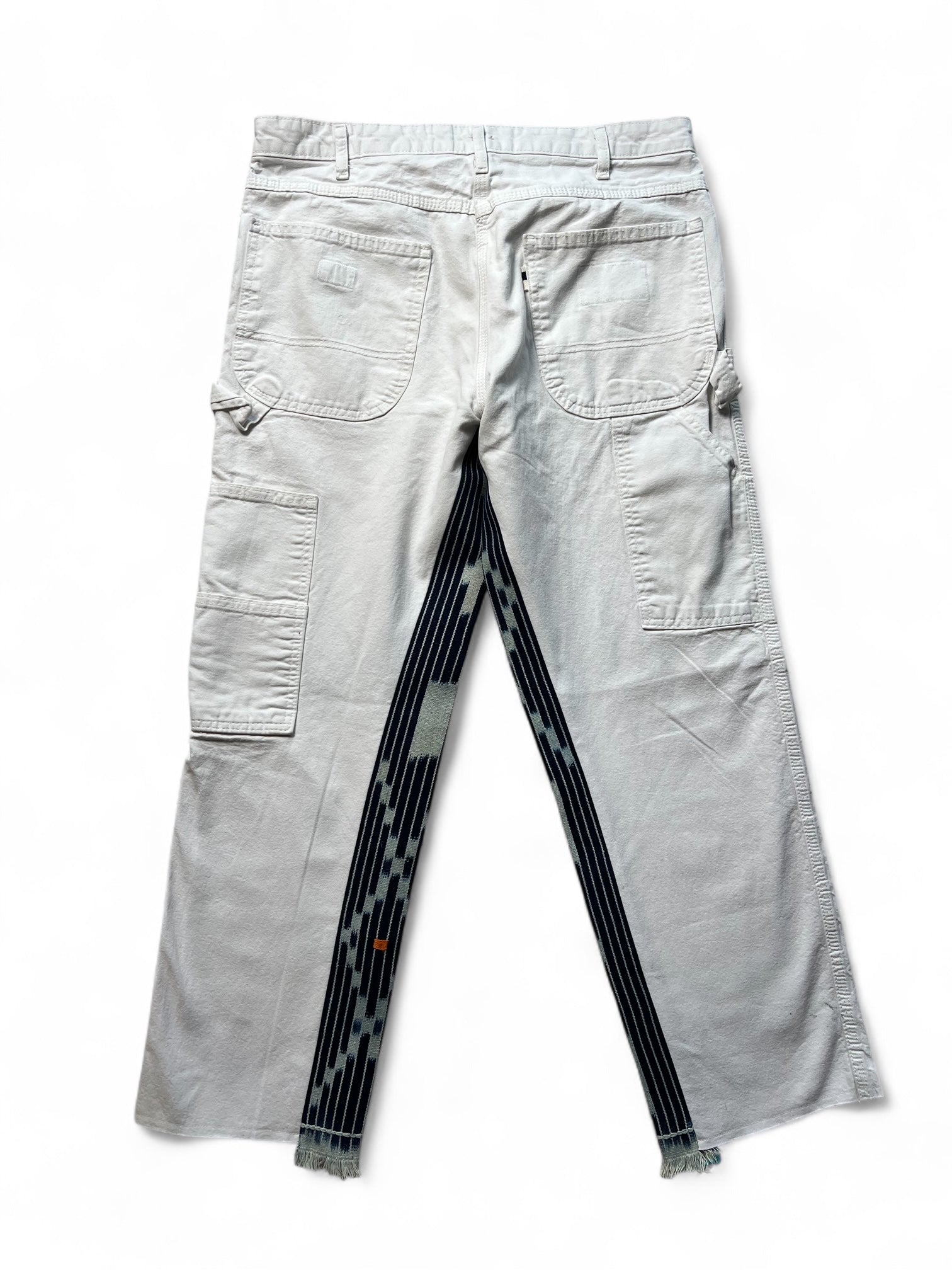 ウエスト約32インチのCOAST PANTSが入荷しました。インディゴ生地がフリンジ付きのもので、左脚にワンポイントでオレンジの刺繍が施されているのがこの生地の特徴です。ホワイトパンツとこのコンビネーションはホワイトとインディゴのネイビーにこのオレンジがアクセントになっているA FRIEND MADEらしい1本だと思います。