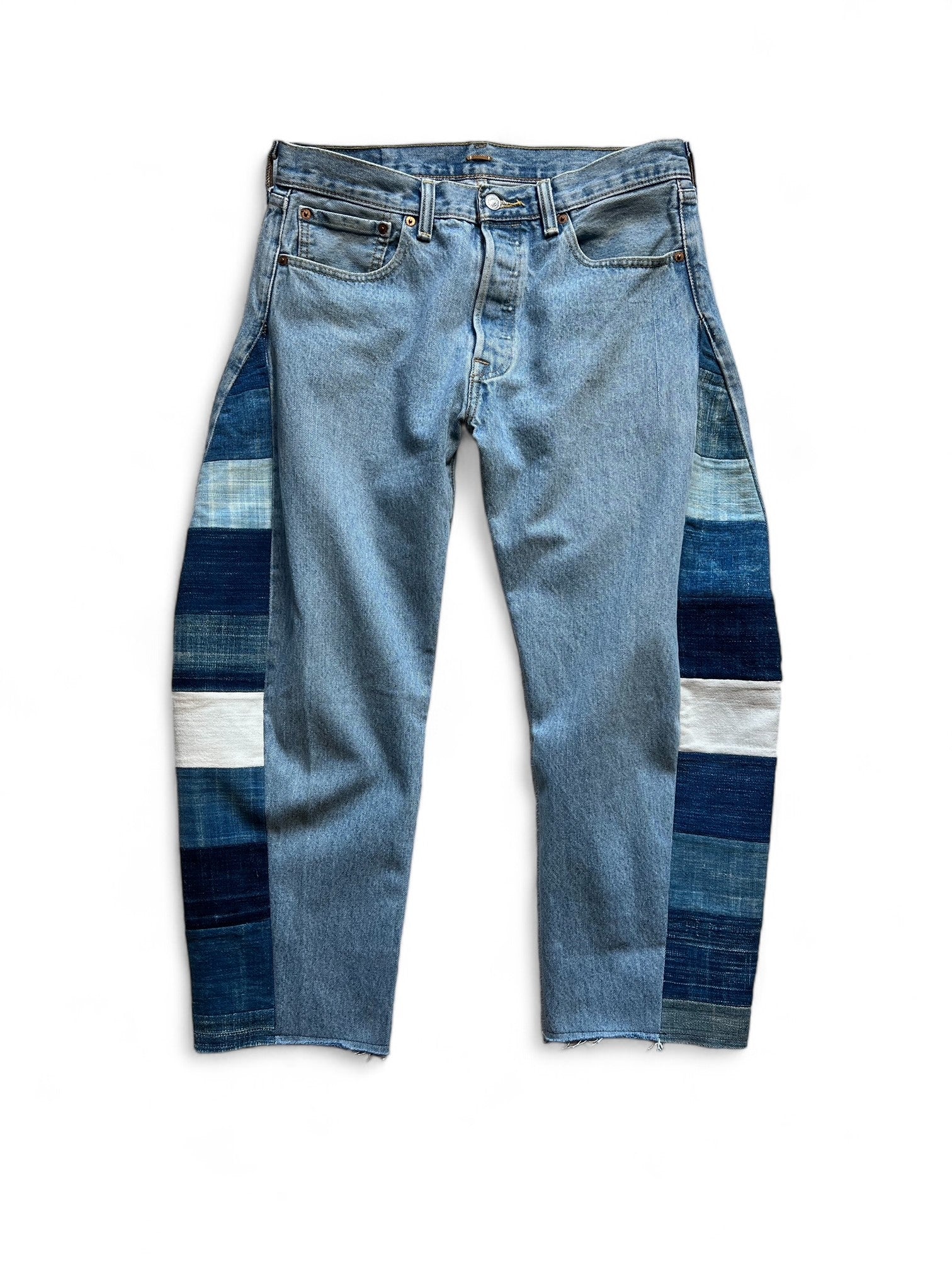 ウェストサイズが約32インチのGIDDY UP JEANです。これはAFRIENDMADEの新しいスタイルのデニムになっています。パンツの外側にインディゴの生地を追加する事でシルエットをワイドタイプのバレルレッグジーンにしています。ウエストサイズをジャストではいても綺麗にワイドレッグのシルエットが出ます。このパンツは使われているインディゴ生地がパッチワークで縫われていて非常に手間のかかっているデニムです。様々なインディゴの持つ表情が追加された特別な1本です
