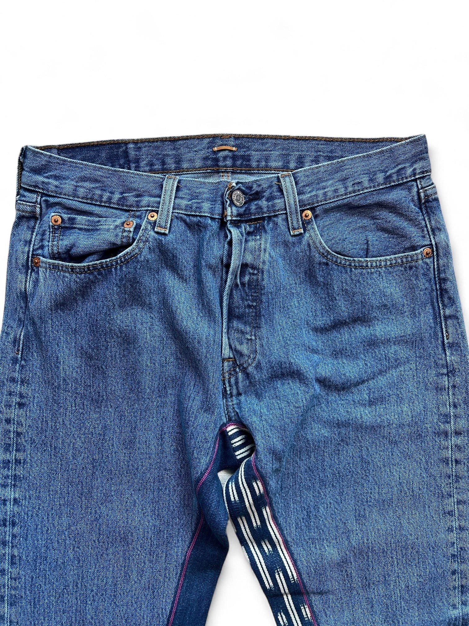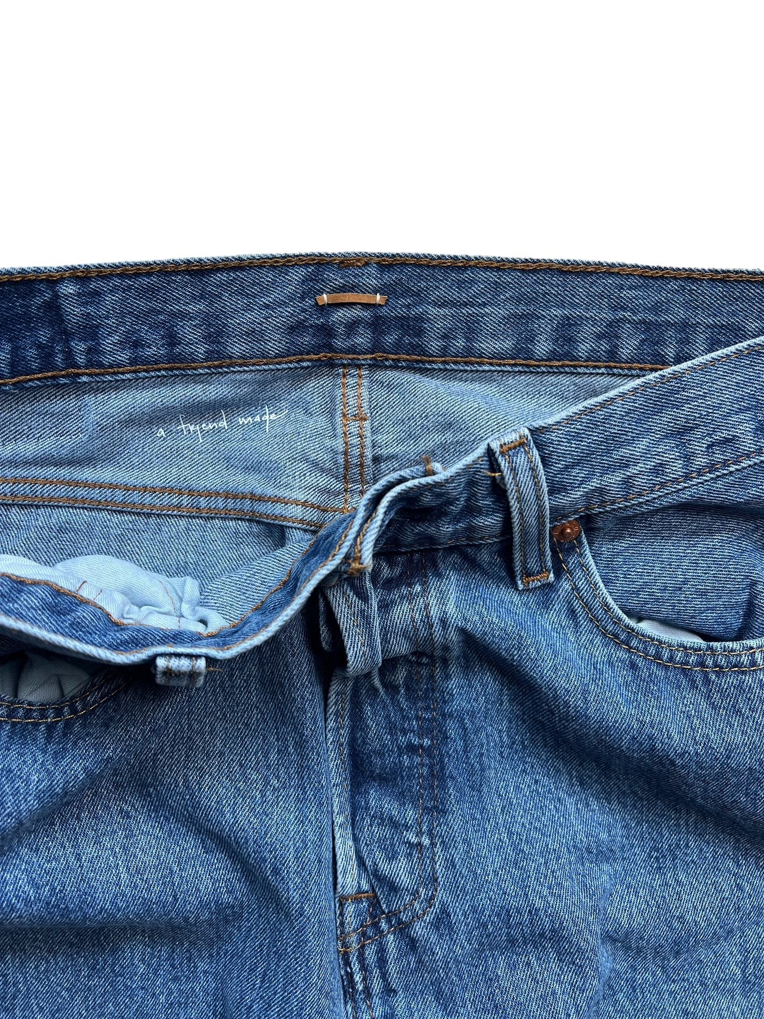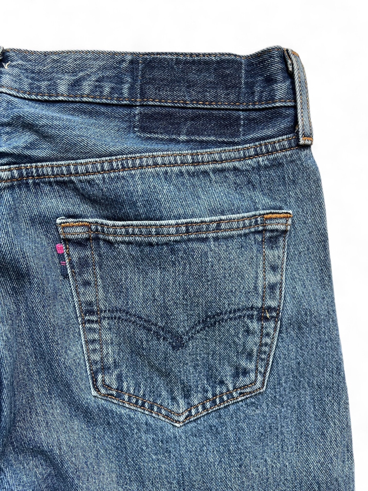 人気のインディゴファブリックが使用されているMATE JEANです。ピンクの糸が縫われているインディゴ生地で且つフリンジ付きとなっているところがこのデニムの人気の理由です。W31というゴールデンサイズです。501をリメイクする事でもともとのストレートレッグではなく、程よくテーパードされたシルエットとクロップドレングスとなっています。通常のデニムのジャストサイズよりも1サイズ以上アップさせて着用することを推奨しています。サンダルやスニーカーで合わせた際にきれいにパンツのシルエットがでます