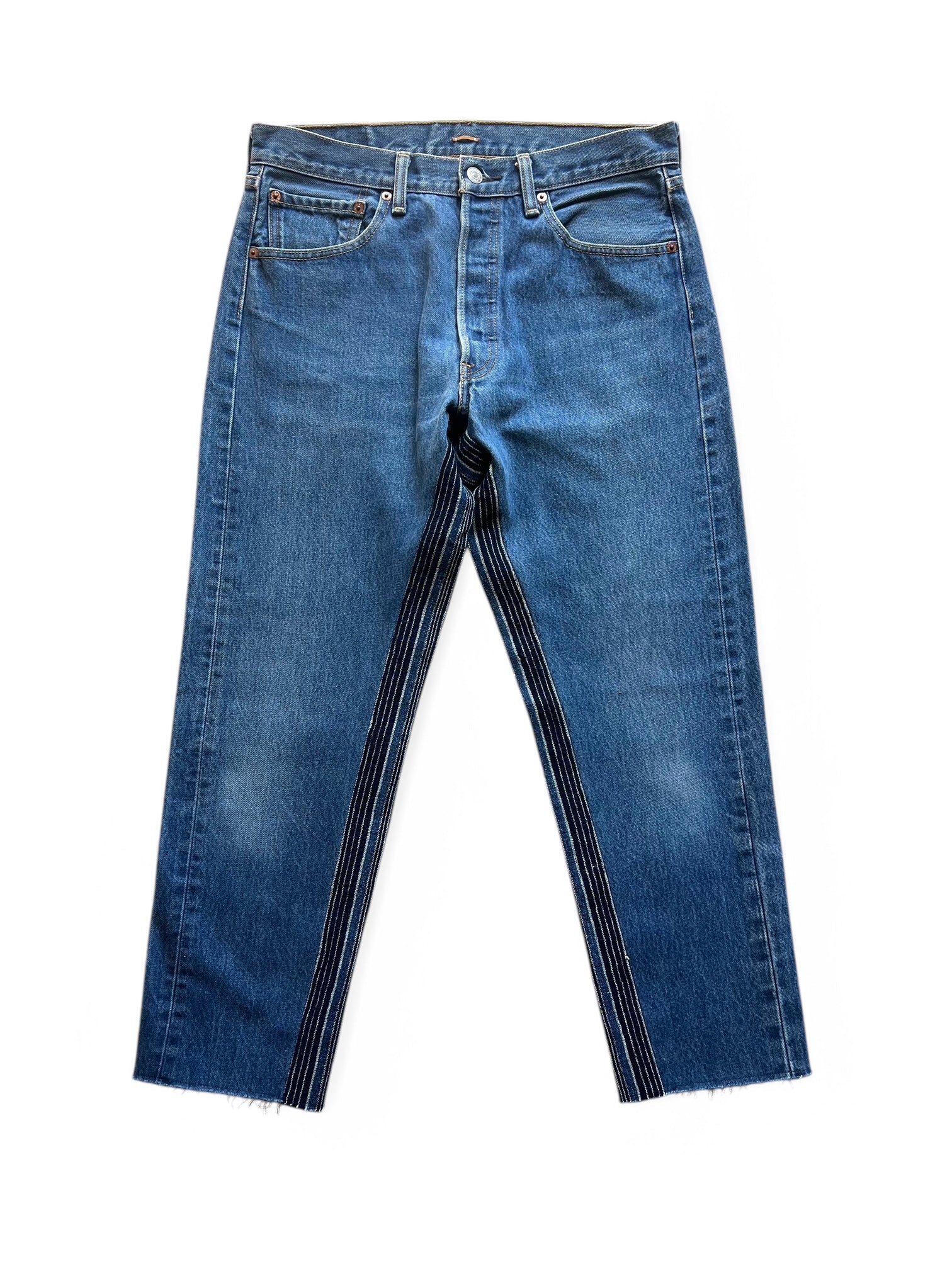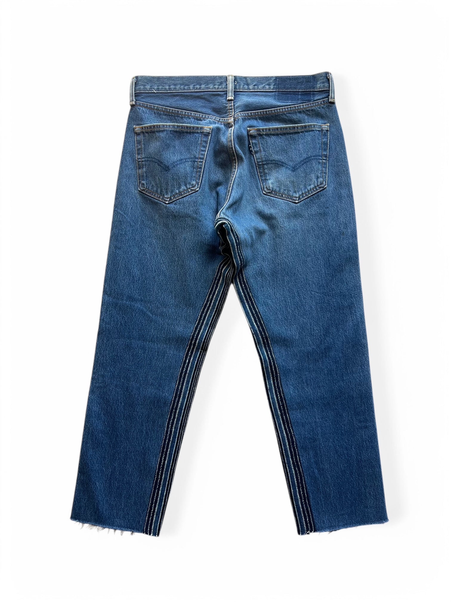 A FRIEND MADEのシグニチャースタイルであるMATE JEANです。デザイナーのマシューはパターンを引かずにデニムのそれぞれの個体にあわせてカッティングを調整したりレングスを調整してこれらのデニムを作成しています。ミッドウォッシュのデニムにインディゴの細いストライプがアクセントカラーになっていてどんなスタイルにもあわせやすいカラーになっていますね。501をリメイクする事でもともとのストレートレッグではなく、程よくテーパードされたシルエットとクロップドレングスとなっていますので、通常のデニムのジャストサイズよりも1サイズ以上アップさせて着用することを推奨しています。サンダルやスニーカーで合わせた際にきれいにパンツのシルエットがでます