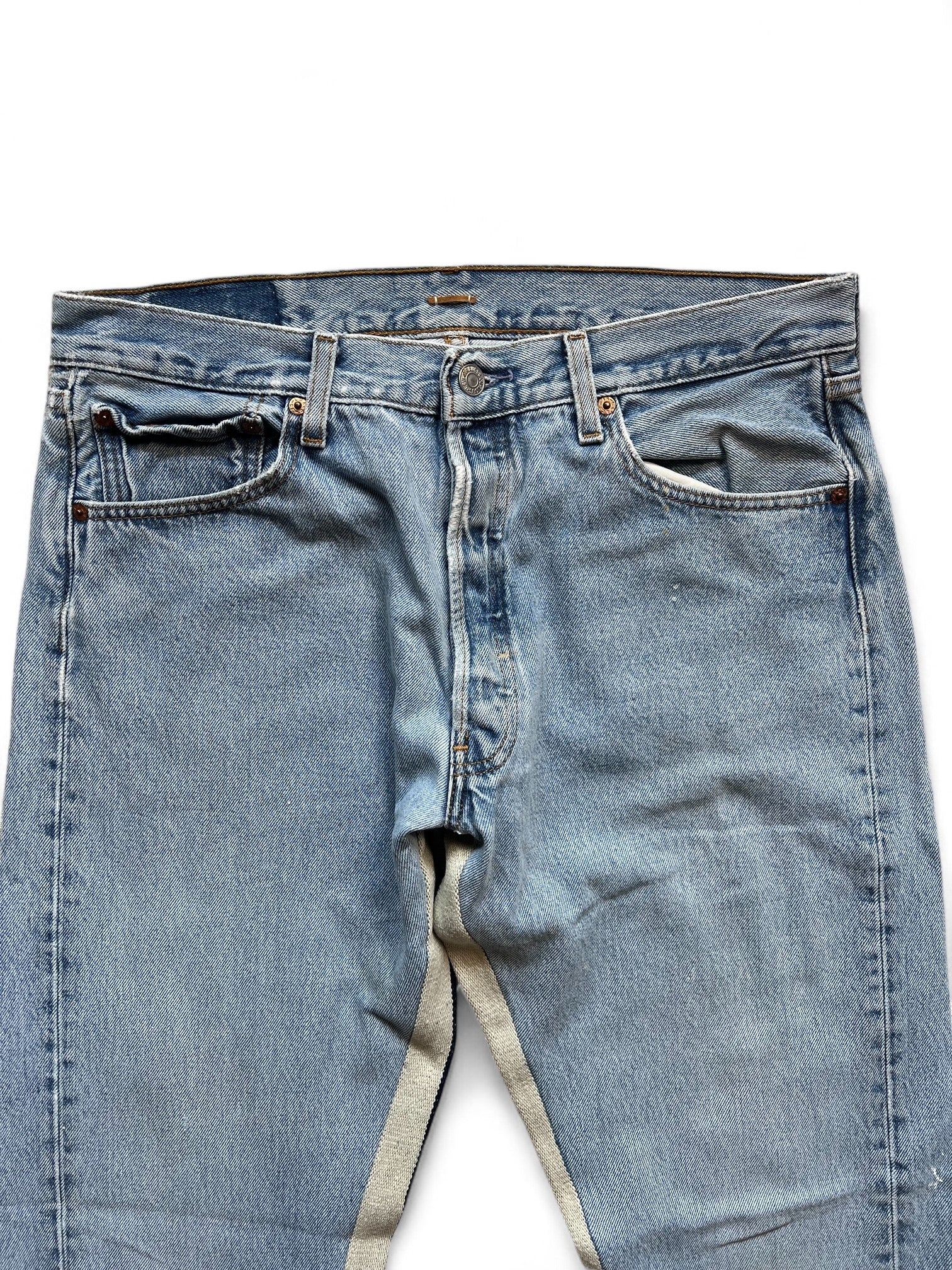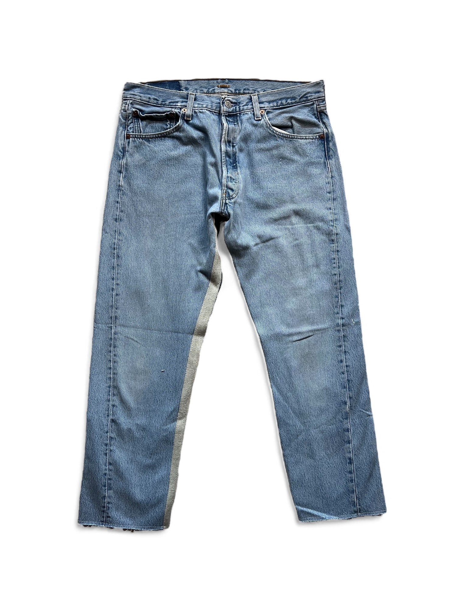 綺麗に色落ちしたデニムにインディゴのストライプが良いアクセントになっています。インディゴの生地がツートーンとなっていて正面からの印象と後ろから見た印象が違うところがカッコいいデニムです。501をリメイクする事でもともとのストレートレッグではなく、程よくテーパードされたシルエットとクロップドレングスとなっています。通常のデニムのジャストサイズよりも1サイズ以上アップさせて着用することを推奨しています。サンダルやスニーカーで合わせた際にきれいにパンツのシルエットがでます