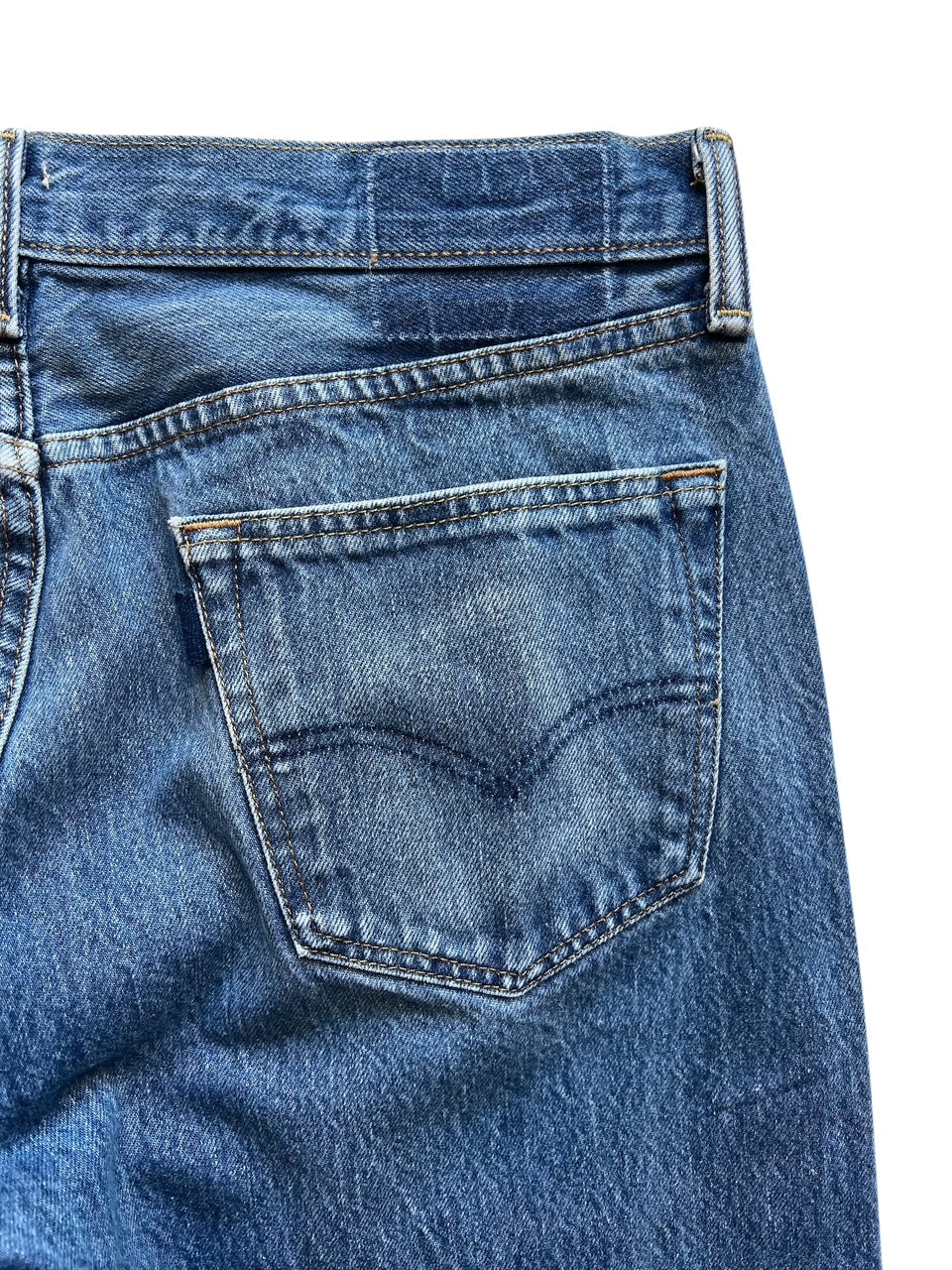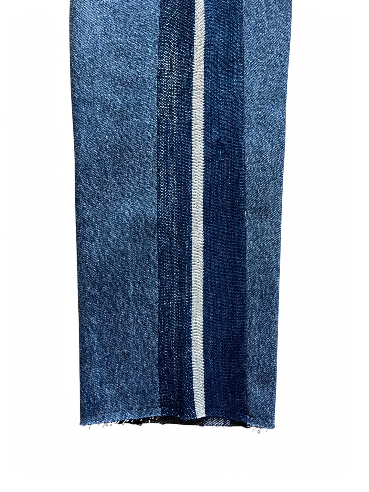 A FRIEND MADEのシグニチャースタイルであるMATE JEANです。デザイナーのマシューはパターンを引かずにデニムのそれぞれの個体にあわせてカッティングを調整したりレングスを調整してこれらのデニムを作成しています。ライトウォッシュのデニムに同系色のストライプが合わせられています。このインディゴはホワイトラインが1本入ってることでデザイン的にもアクセントになってますね。マシューは一本ずつのデニムの色味にあわせてインディゴの生地を選んでいます。デニムになじませたり、アクセントカラーにしたりとひつつずつ個性が違うのも魅力のひとつですね。501をリメイクする事でもともとのストレートレッグではなく、程よくテーパードされたシルエットとクロップドレングスとなっていますので、通常のデニムのジャストサイズよりも1サイズ以上アップさせて着用することを推奨しています。サンダルやスニーカーで合わせた際にきれいにパンツのシルエットがでます