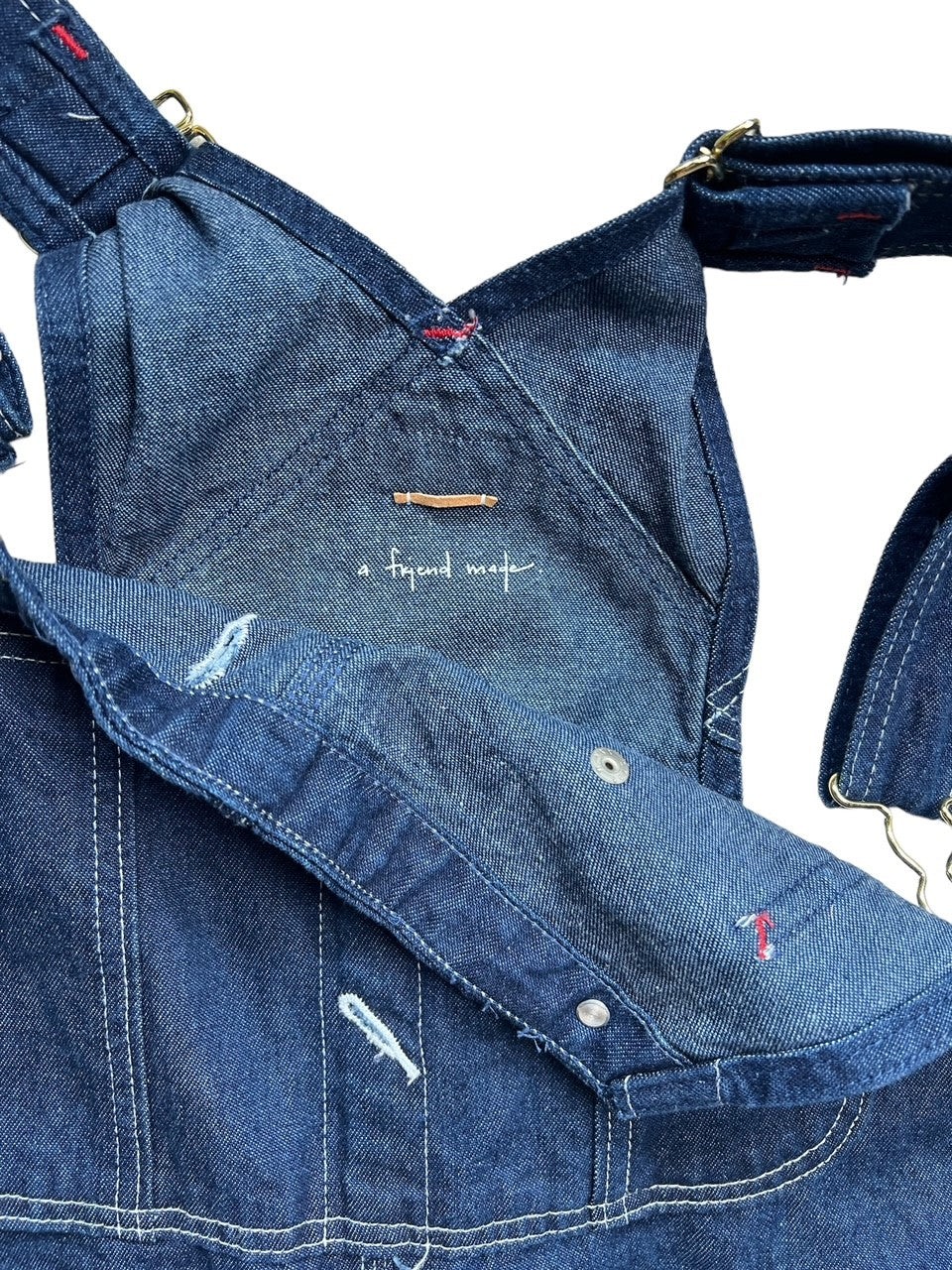 A FRIEND MADで初めてのオーバーオールです。ディッキーズのオーバーオールをリメイクされて作られています。濃い色味のデニムと濃い色のインディゴ生地とホワイトのストライプが良いアクセントになっています。MATE JEANと同じシグニチャーディティールのインディゴタブもしっかり縫い付けられています。濃い目のデニムですので、色落ちなどさせて自分だけの1本に育てることもできますね。