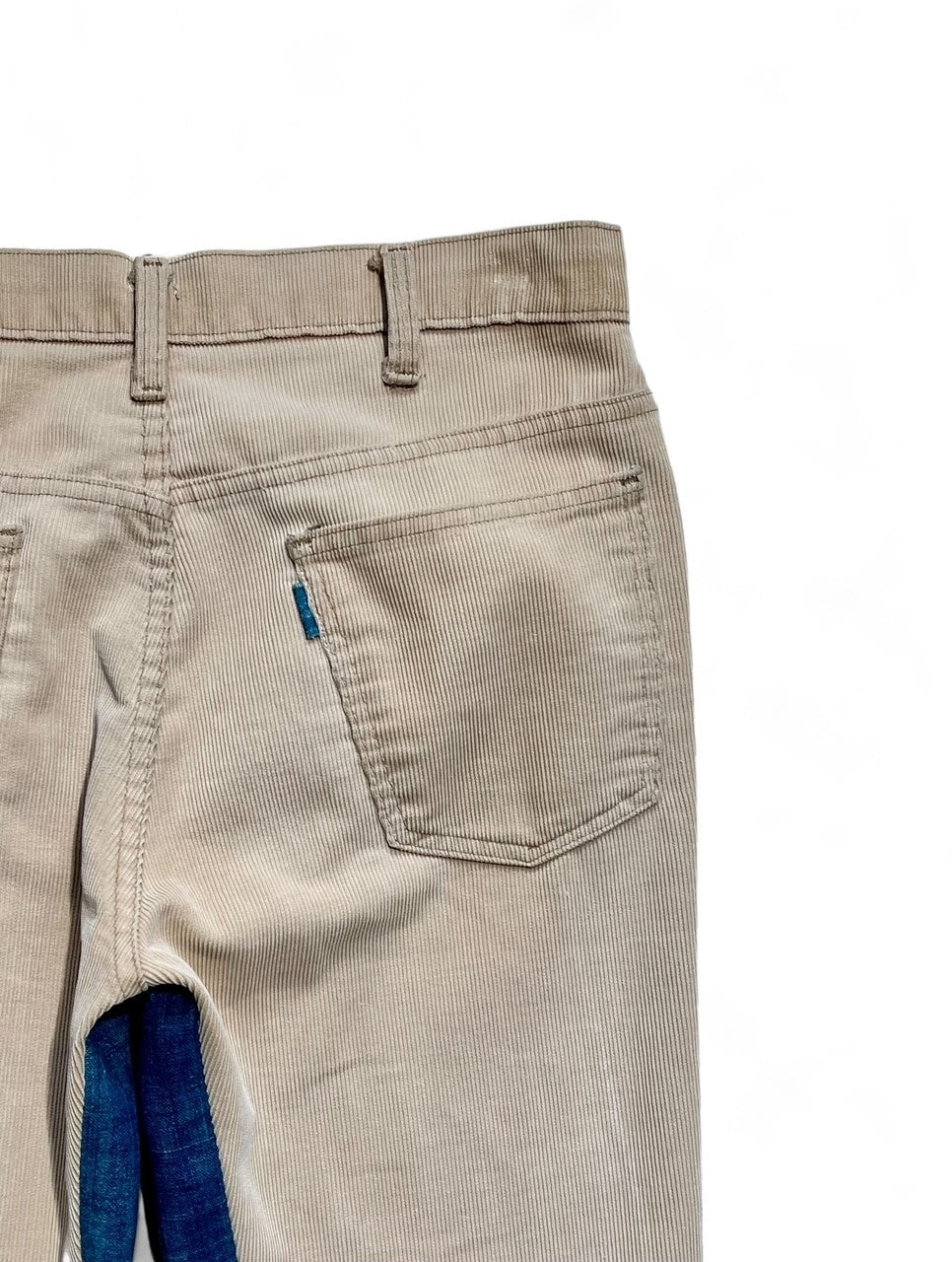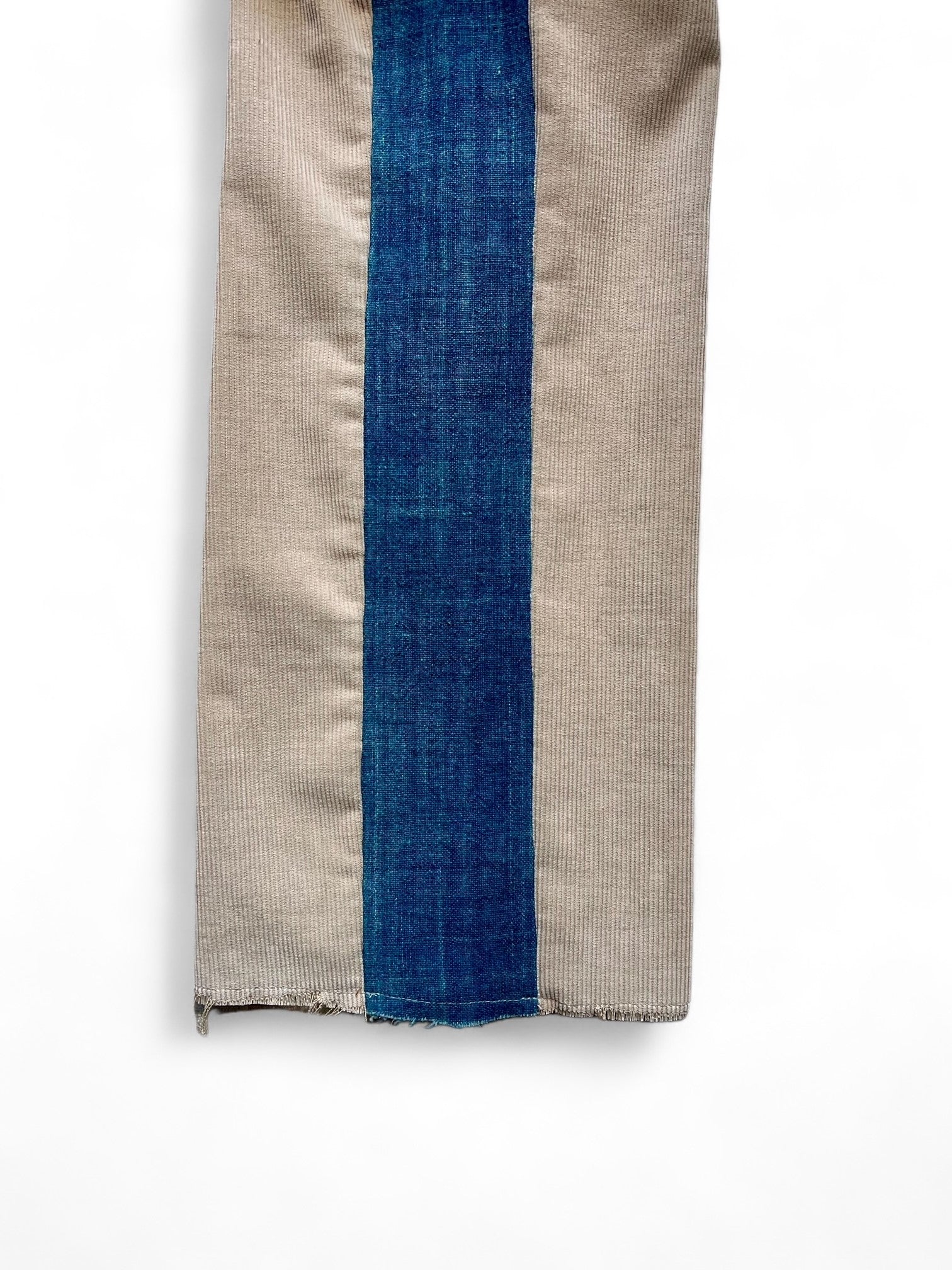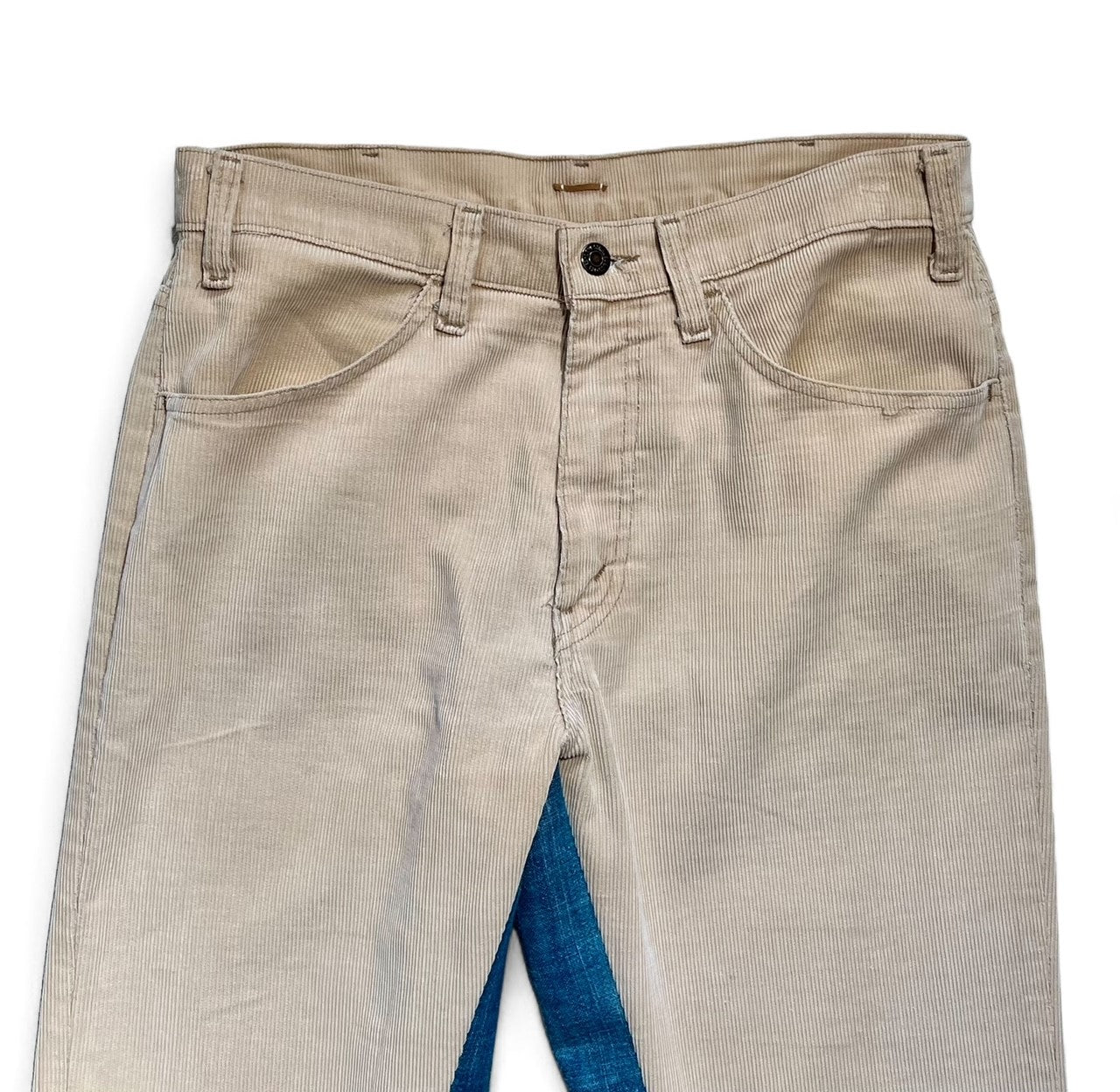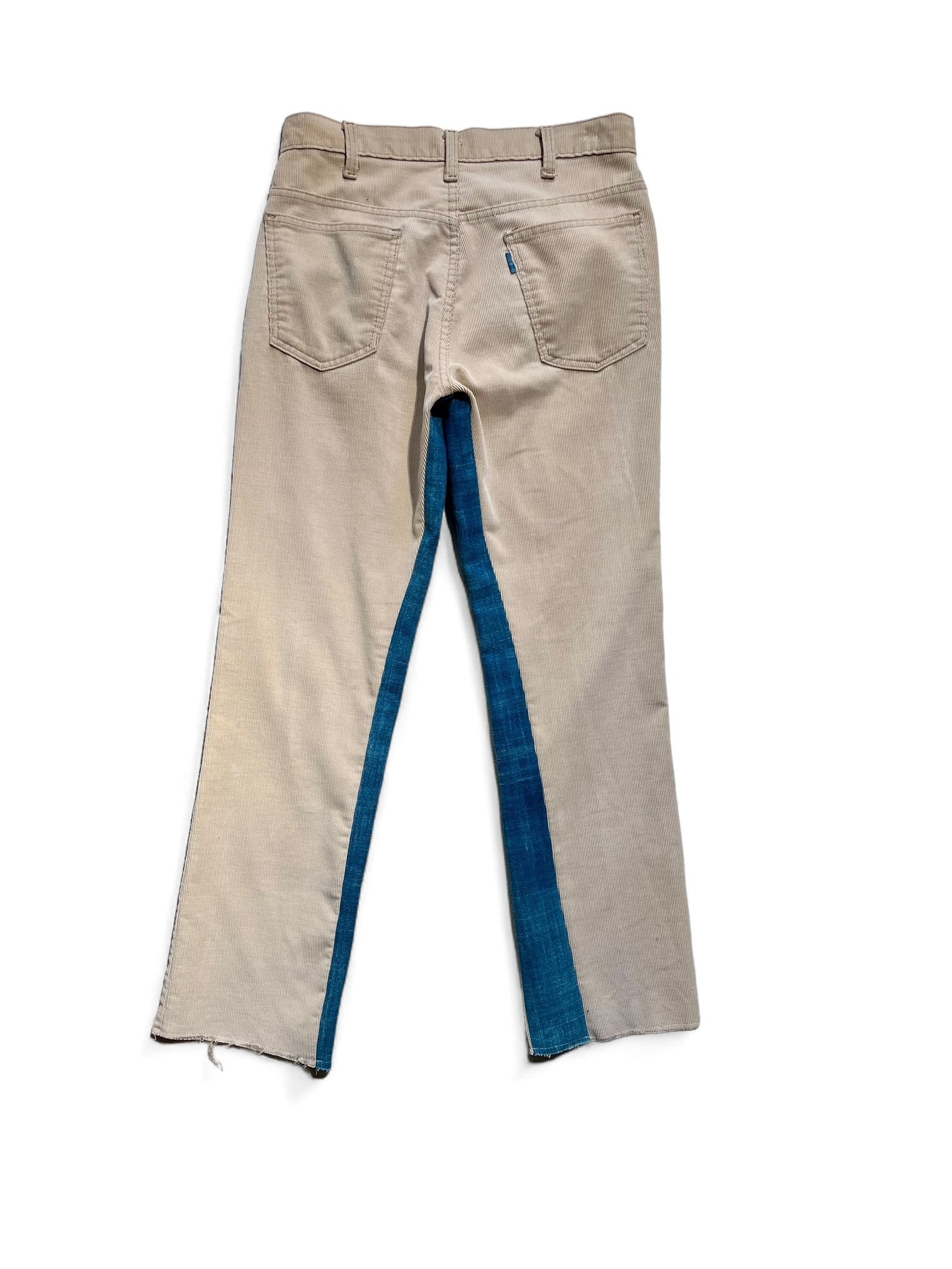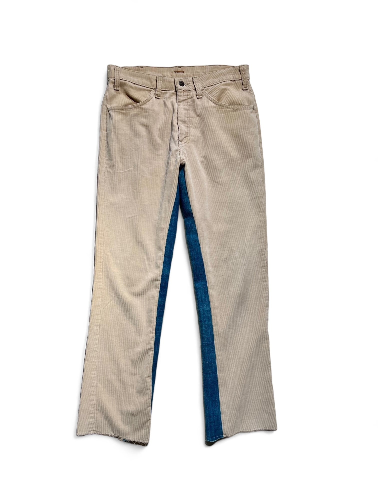 リーバイスの517のコーデュロイパンツとビンテージのインディゴファブリックのリメイクパンツになります。517はリーバイスの中で緩やかなブーツカットスタイルのパンツです。明るいベージュのカラーとインディゴの組み合わせで新しい表情のパンツになっています。秋冬の印象のあるコーデュロイですが、春でも合わせ方で問題なく取り入れることができます。デニムシャツやシャンブレーシャツ、フランネルシャツなどさらっと羽織って合わせたいですね。